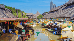 Pattaya Floating Market, riverside attraction in Pattaya displaying and showcasing the beautiful ancient Thai riverside living